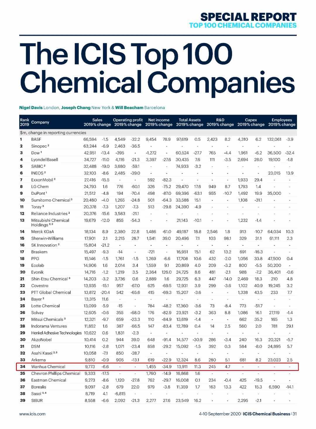 Recently, ICIS released the top 100 chemical companies in 2019.